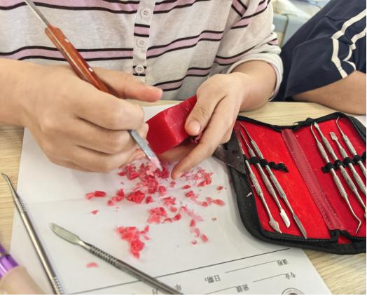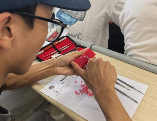 面向老生的“雕牙比赛”,则聚焦专业核心实操技能,考察学生对牙齿形态的精准把控、雕刻手法的规范性及卫生习惯等职业素养。竞赛过程中,学生们专注投入,充分展现专业学习成果。比赛不仅检验了高年级学生的专业基本功,更激发了大家精益求精的工匠精神。