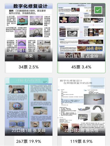 活动在九龙湖校区学生服务中心同步进行现场展出和线上投票,吸引了学院全体师生参与交流、分享和讨论。通过激烈的角逐,数字化修复设计、跨牙弓种植修复、智能辅助根管口定位等作品脱颖而出,分别荣获不同等级荣誉。