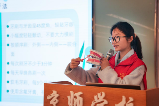 随后,口腔医学院的师生结合青少年口腔健康特点,通过趣味PPT、牙齿模型演示和互动问答等形式,深入浅出地讲解了龋齿预防、正确刷牙方法、饮食健康等口腔防护知识。现场还开展了“刷牙小能手”实操比赛,学生们踊跃参与,在轻松愉快的氛围中掌握了科学护齿技能。